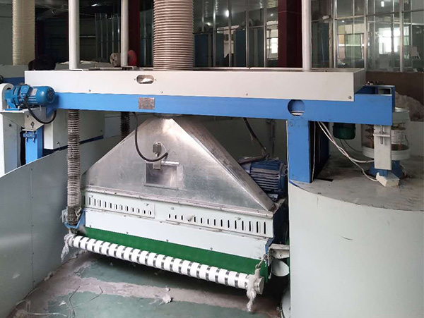 本產品排列于開清棉機的一道式序,適用于加工棉、棉型化纖和中長化纖,可兩臺并聯使用,其中一臺抓棉機抓頂部纖維,另一臺抓棉機抓底部纖維或兩臺同時抓中部纖維。間隙下降的抓棉機打手隨小車運轉作順序抓取。被抓取的纖維束塊籍風機抽吸經輸棉管道送至下部機臺。